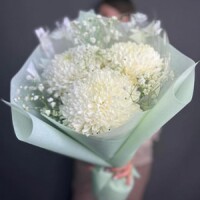 Шаровидная хризантема 3шт в нежном оформлении, с оранжеровочной зеленью