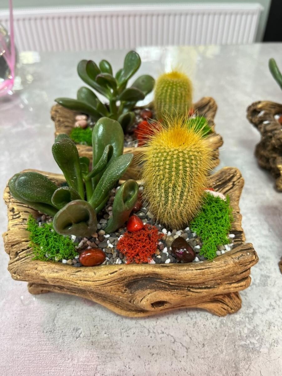 Комнатные растения (кактусы, суккуленты) в керамическом кашпо.