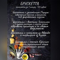 Брускетта с Хамоном с сыром камамбер под фирменным соусом, фисташки.